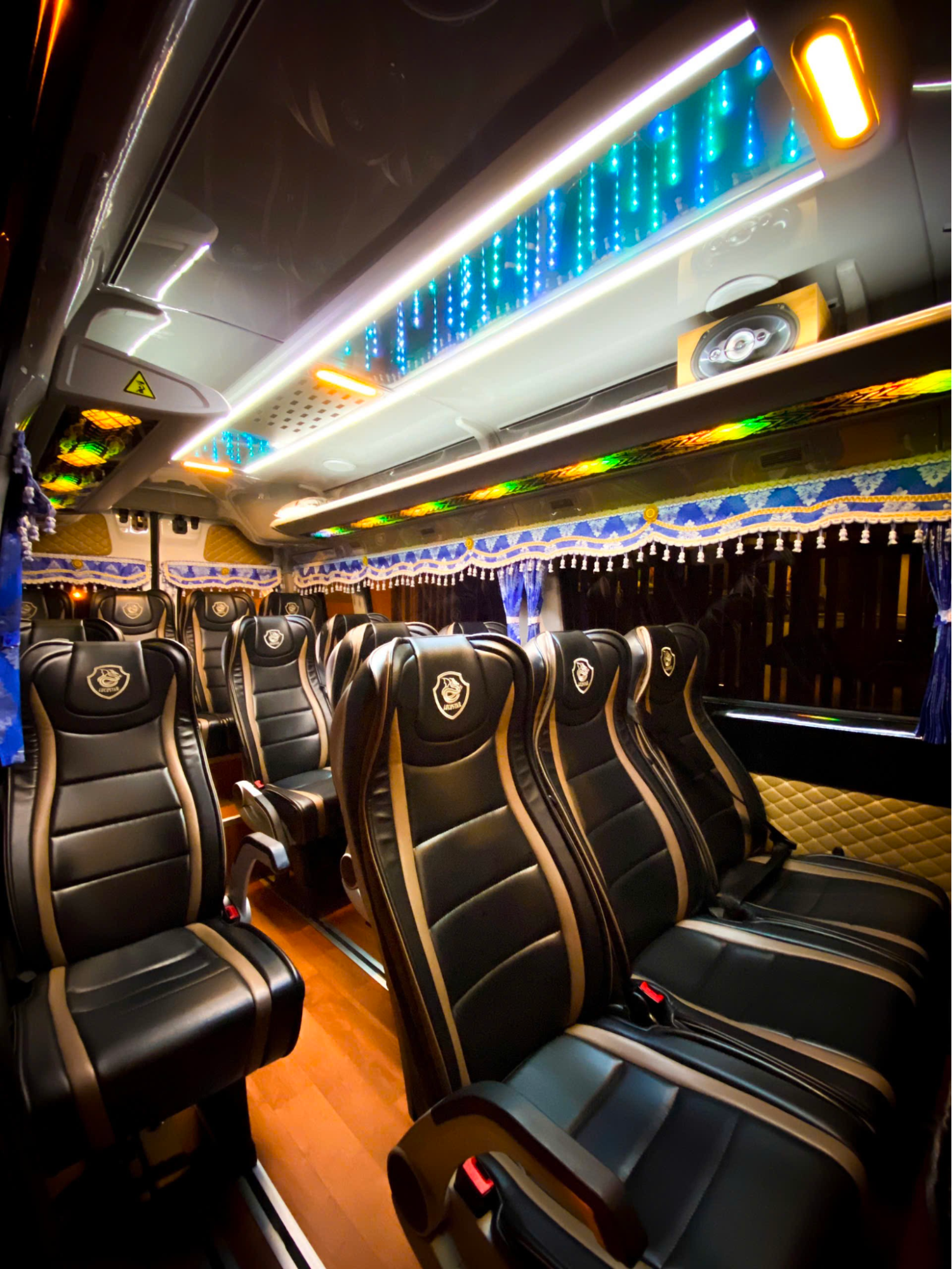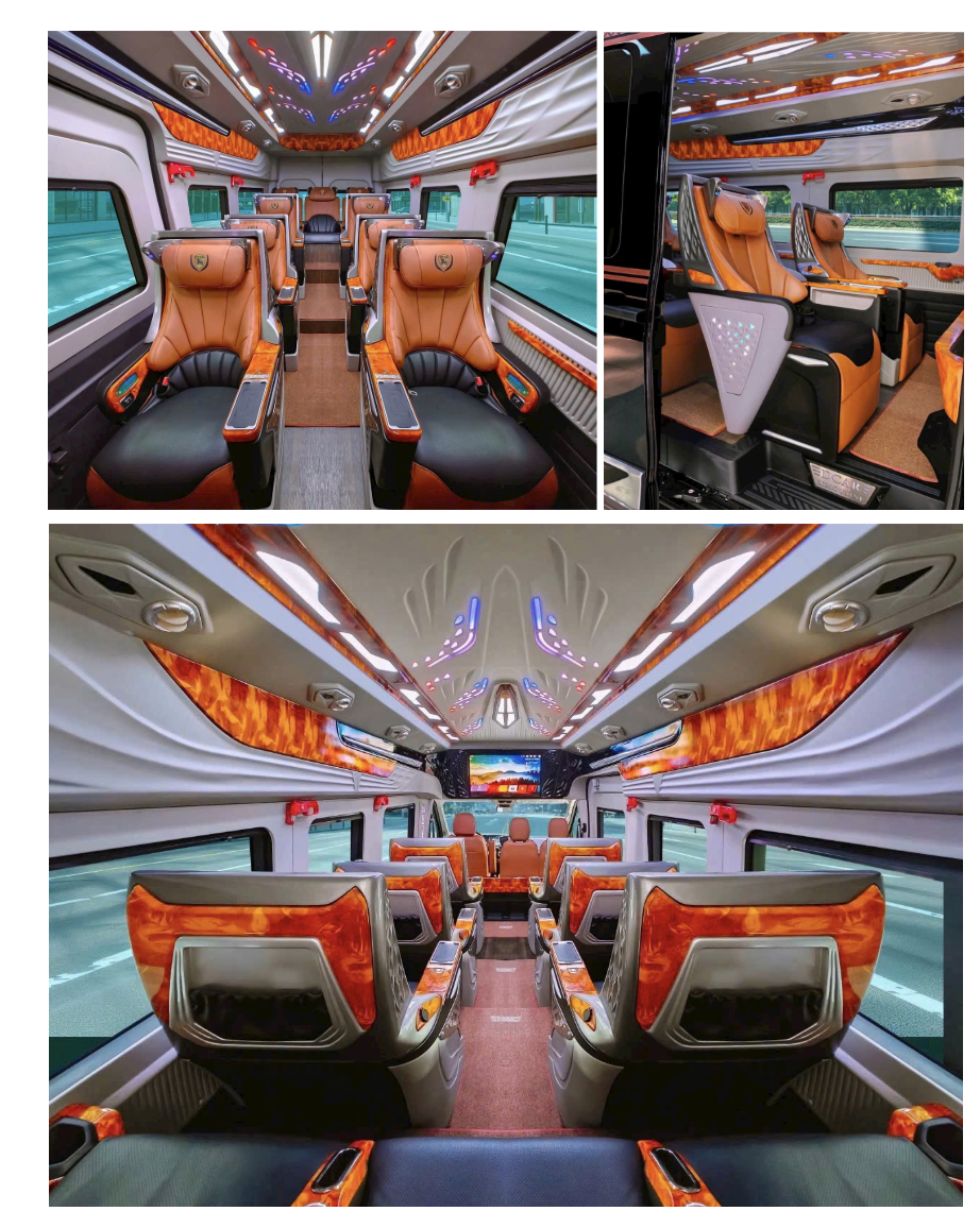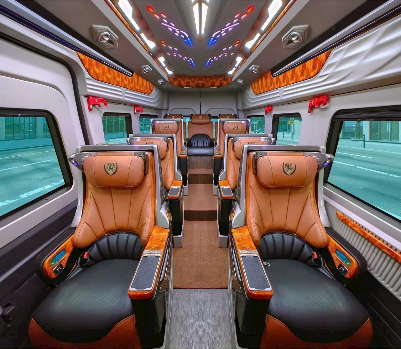 Xe 12 chỗ có thiết kế tương tự nhưng mở rộng thêm một hàng ghế, giúp tối ưu chỗ ngồi cho nhóm lớn hơn (10-12 người). Xe 12 chỗ thường trang bị nội thất và tiện nghi tương đương xe 9 chỗ – ghế massage, điều hòa đa vùng, màn hình giải trí, wifi, cổng sạc USB…, đảm bảo mỗi hành khách đều có trải nghiệm cao cấp.